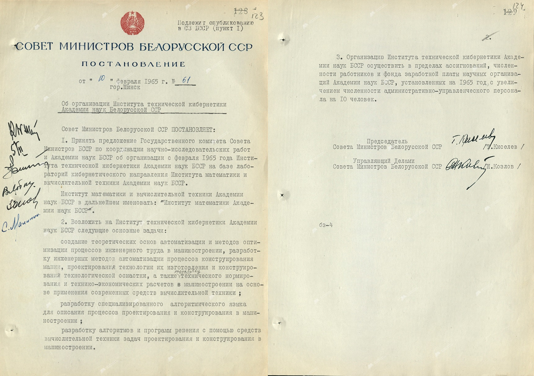 Институт технической кибернетики (ИТК) Академии наук БССР считается вступившим в число действующих институтов Академии наук БССР с 10 февраля 1965 г. Институт включен в состав Отделения физико-технических наук Академии наук БССР.
